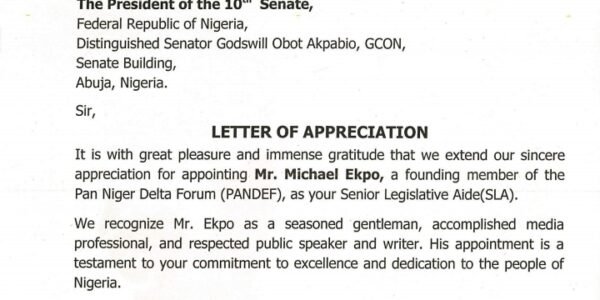 The leadership of the Pan Niger Delta Forum (PANDEF) Youth Wing has expressed profound appreciation to the Senate President, Godswill Akpabio, for appointing Mr. Michael Ekpo, one of its pioneering youth leaders, as a Senior Legislative Aide. In a letter…