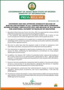 Akwa Ibom State Governor, Pastor Umo Eno, PhD, has approved the immediate release of N120 billion for the payment of contractors handling state projects, alongside an additional N1.5 billion for the settlement of outstanding gratuities owed to retired public servants.