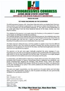 The APC Akwa Ibom State chapter congratulated Governor Eno on his achievements and bold steps taken to unite the people, and looks forward to working with him to achieve greater success for the state.